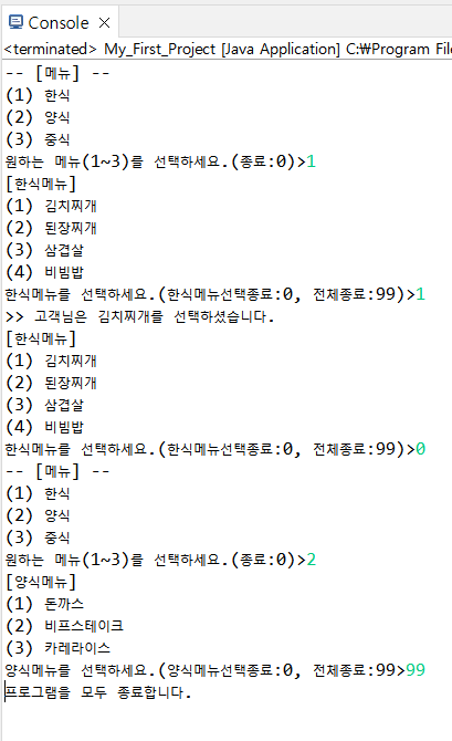 System.out.print("중식메뉴를 선택하세요.(중식메뉴선택종료:0, 전체종료:99>");