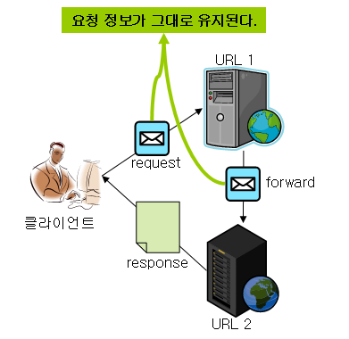 Forward는 Web Container 차원에서 페이지의 이동만 존재합니다. 실제로 웹 브라우저는 다른 페이지로 이동했음을 알 수 없습니다. 그렇기 때문에 웹 브라우저에는 최초에 호출한 URL이 표시되고, 이동한 페이지의 URL 정보는 확인할 수 없습니다. 또한 현재 실행중인 페이지와 forward에 의해 호출될 페이지는 Request 객체와 Response 객체를 공유합니다.