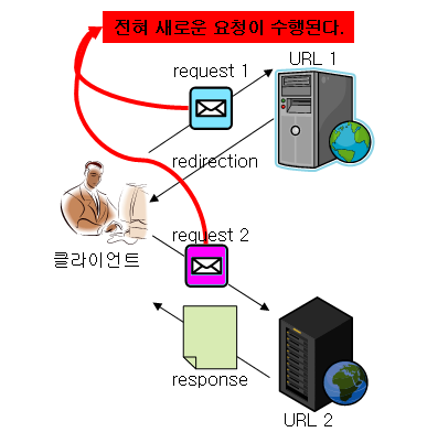 Redirect는 Web Container로 명령이 들어오면, 웹 브라우저에게 다른 페이지로 이동하라고 명령을 내립니다. 그러면 웹 브라우저는 URL을 지시된 주소로 바꾸고 해당 주소로 이동합니다. 다른 웹 컨테이너에 있는 주소로 이동하며 새로운 페이지에서는 Request와 Response객체가 새롭게 생성됩니다.