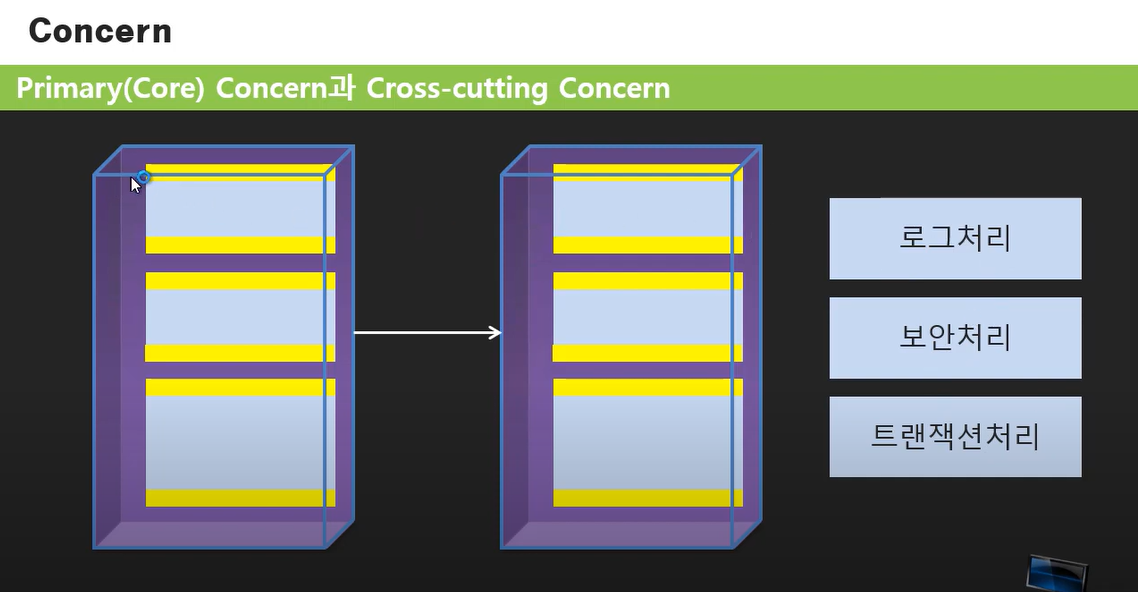 - 상단의 이미지처럼 인프라 로직의 중복이 횡단으로 나타남 => cross-cutting concern 횡단 관심사